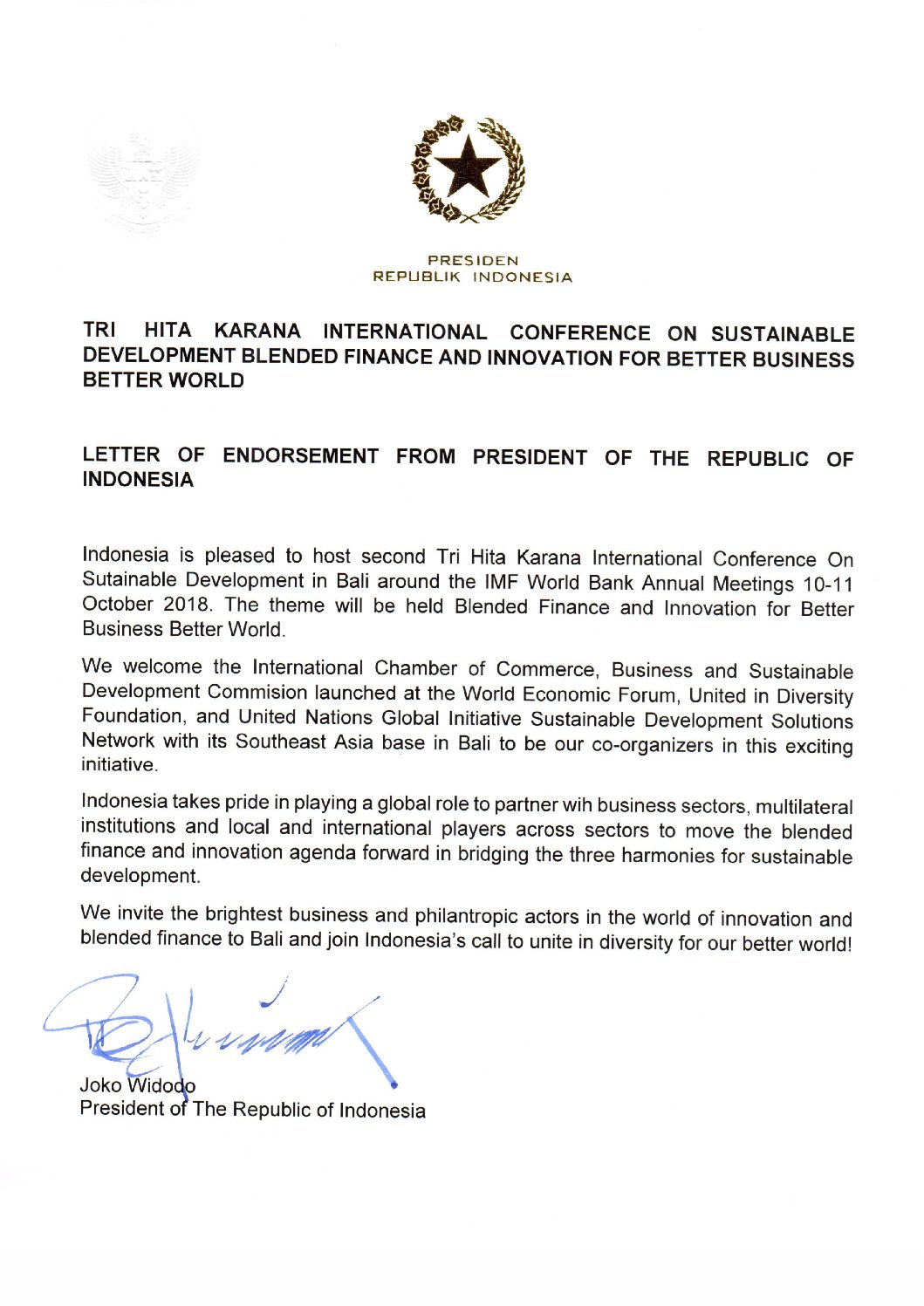 Letter of Endorsement From President of The Republic of Indonesia for The Hita Karana International Conference 2018